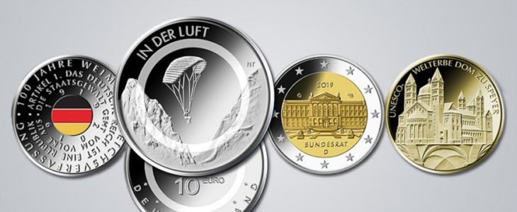 Die Bundesrepublik Deutschland gibt in diesem Jahr 20-Euro-Silbermünzen heraus, sowie im Rahmen der laufenden Serien 2019: 20-Euro-, 50-Euro- und 100-Euro-Goldmünzen. Innerhalb der Serie “Bundesländer” die 2-Euro-Gedenkmünze und innerhalb der Serie “Klimazonen der Erde” die 5-Euro-Münze “Gemäßigte Zone”. Erstmals erscheint eine 10-Euro-Münze “In der Luft” mit Polymerring aus der Serie “Luft bewegt”.