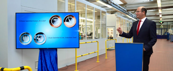 Herr Staatsminister Albert Füracker, MdL, stellt die beiden Sammlermünzen, 5-Euro „Subpolare Zone“ sowie 10-Euro „Luft bewegt – an Land“, am 8. September 2020 im Bayerischen Hauptmünzamt vor.