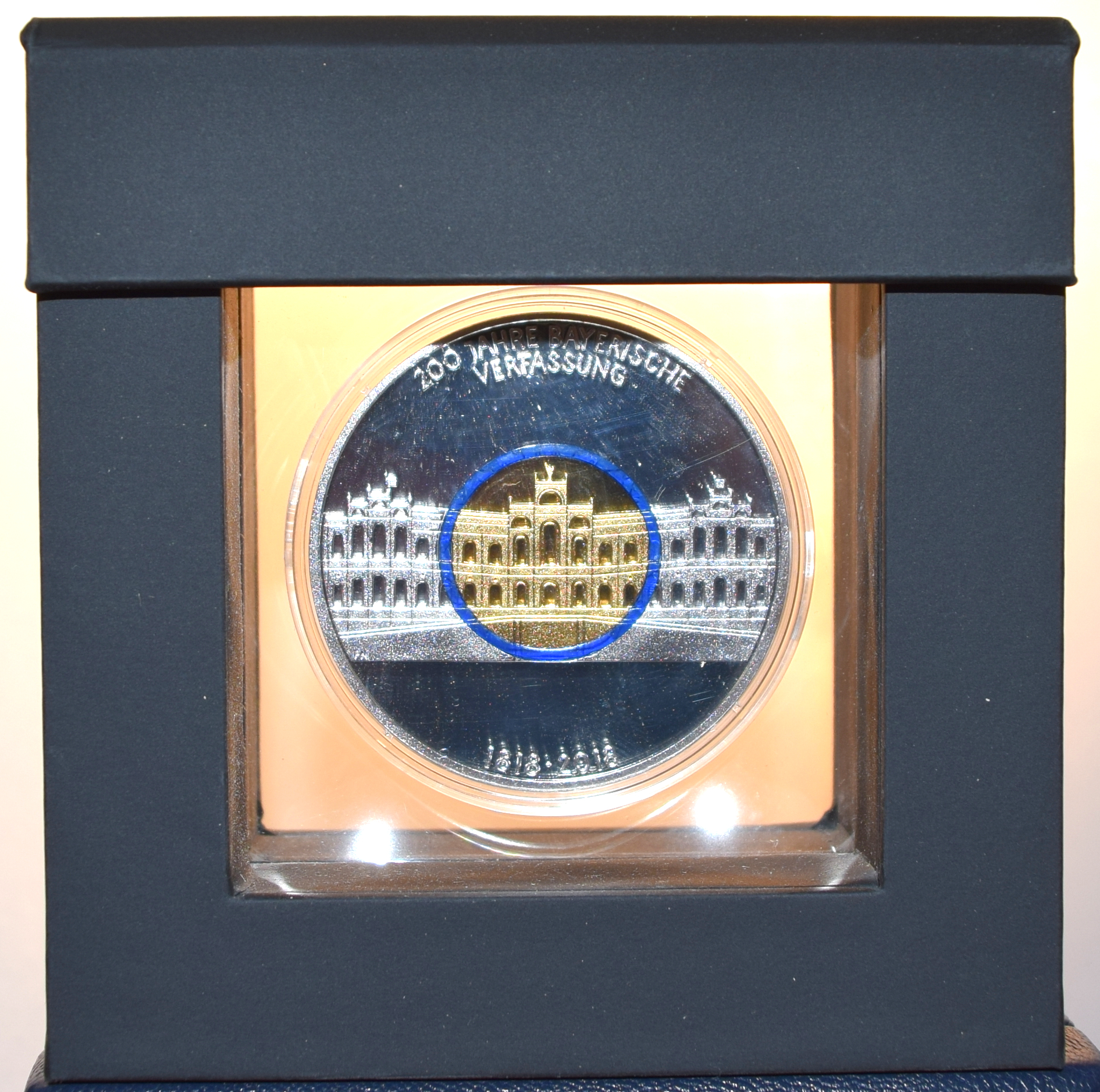 Die Medaille wird im Rahmen in eine strapazierfähige, durchsichtige, Silikon-Membran eingelegt. So hat man sein Schmuckstück jederzeit im Blick.